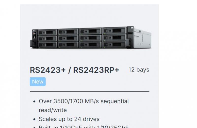 Synology RackStation RS2423+/RS2423RP+ and DiskStation DS1823xs+ Go Back Synology® introduces RS2423+/RS2423RP+, a flexible storage solution for SMBs Synology RackStation RS2423+ ...