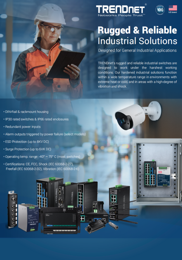TRENDnet’s family of rugged industrial switches come in varying port counts with features, such as gigabit, unmanaged, web smart,